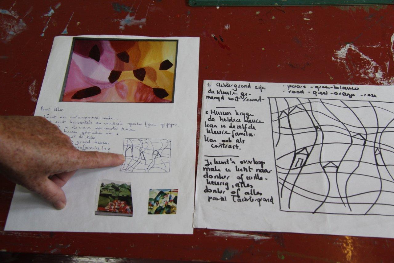 Een goede beginopdracht is werk te maken naar aanleiding van Paul Klee. Deze Duitse kunstenaar is wereldberoemd geworden, maar hij haalde zijn onderwerpen gewoon dicht bij huis. Het is heel navolgbaar wat hij doet en toch wonderschoon. Hij zet een paar lijnen op papier, van rand tot rand of overdwars. Doe dat na en al kijkend naar zijn werk, is er een kleurrijke vlakindeling te maken.