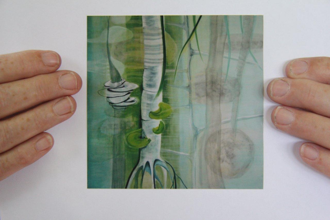 Ze maakt tekeningen, plakt met transparant papier werelden over elkaar, schildert met acrylverf, olieverf en meer. Zelden is er maar één techniek gebruikt, zelden staat er slechts één ding in beeld; juist het combineren van verschillende lagen en invalshoeken is haar ding. En dat doet ze heel precies. De oorsprong van dat wat leeft – zoals de cellen in de natuur en het lichaam zit in haar werk.